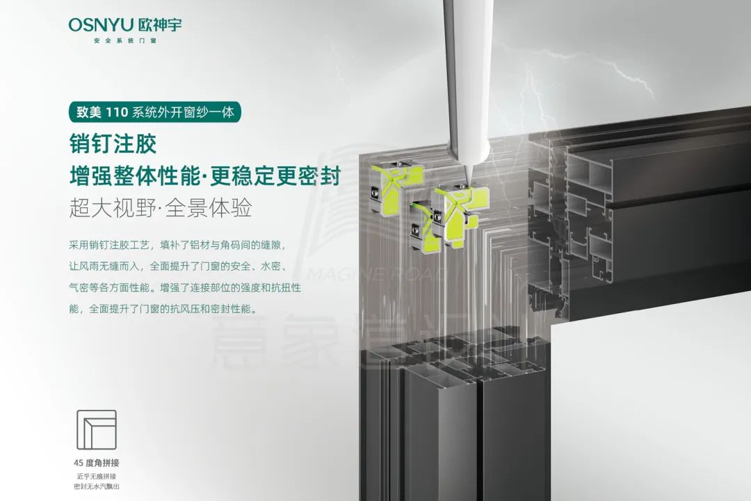 欧神宇门窗深知,细节决定品质。在致美110系列中,创新引入了销钉注胶工艺,这一匠心独运的设计巧妙地填补了铝材与角码间的微小缝隙,仿佛为门窗穿上了一层隐形的雨衣,让风雨无缝可入。